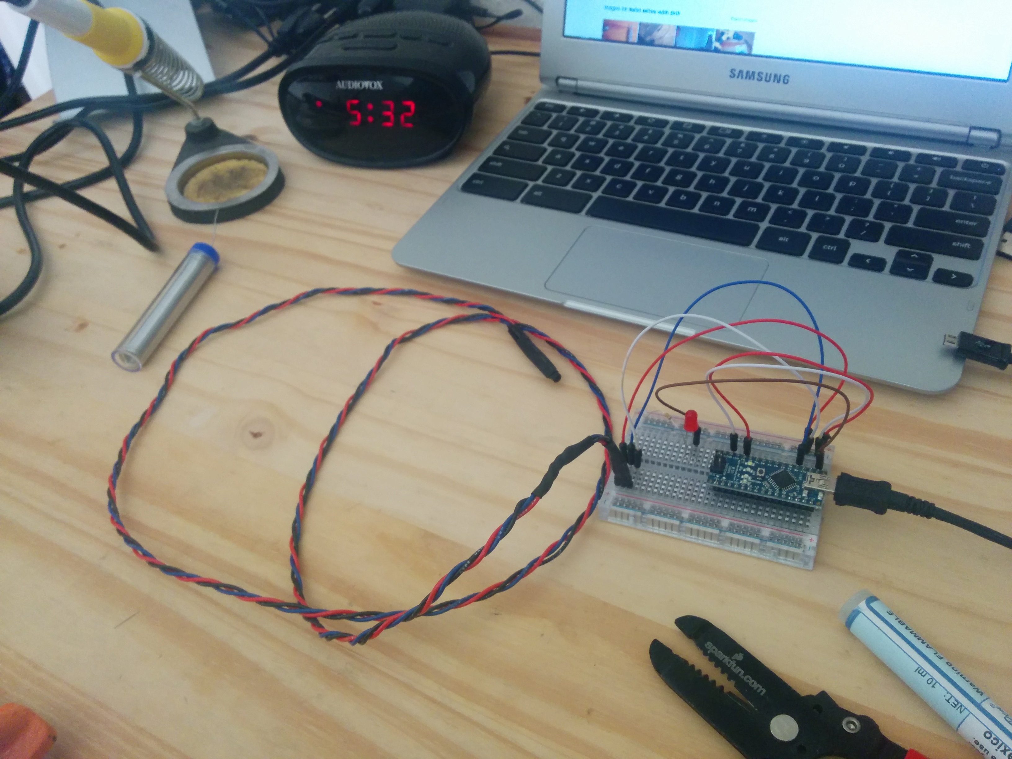 The TMP36 sensor hooked up to the Arduino. Due to issues with the analog signal, I had to change this sensor out for a digital one.