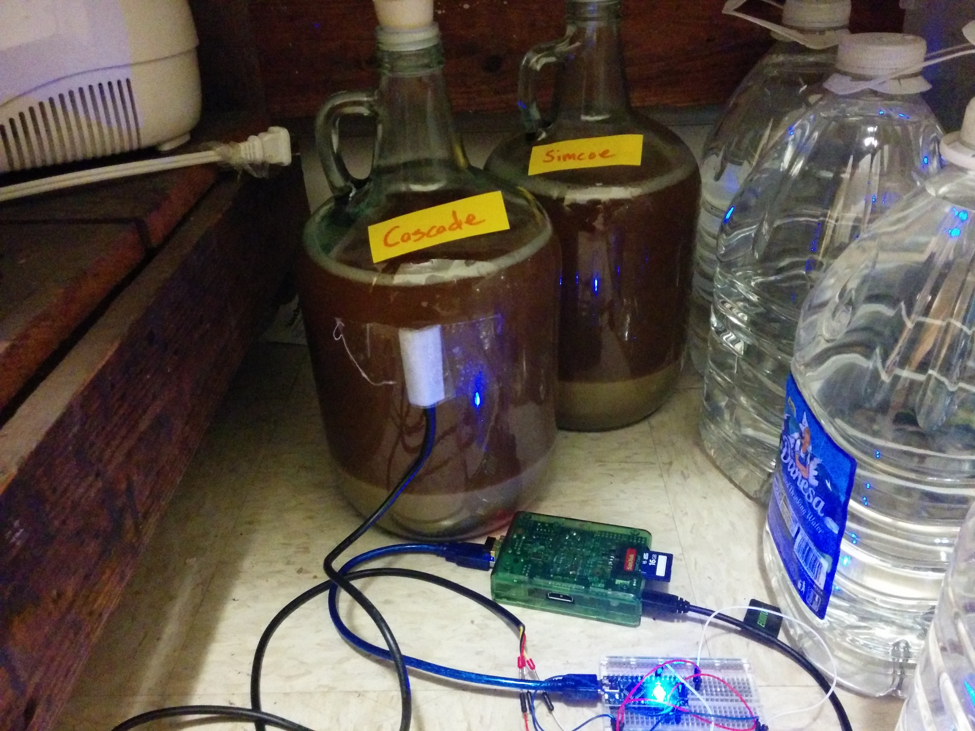 Here is the final setup. The sensor is taped to the glass carboy, with the piece of foam on the outside. The Arduino and RasPi are in the foreground.