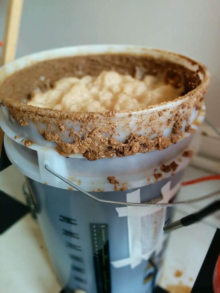 Things got pretty crazy at night. I left the bucket slightly ajar to prevent any explosions. Some krausen leaked out and got all over the place. Not a huge deal though, plenty of CO2 was being produced to keep away bacteria, and vigorous fermentation is a much better problem to have than no fermentation.