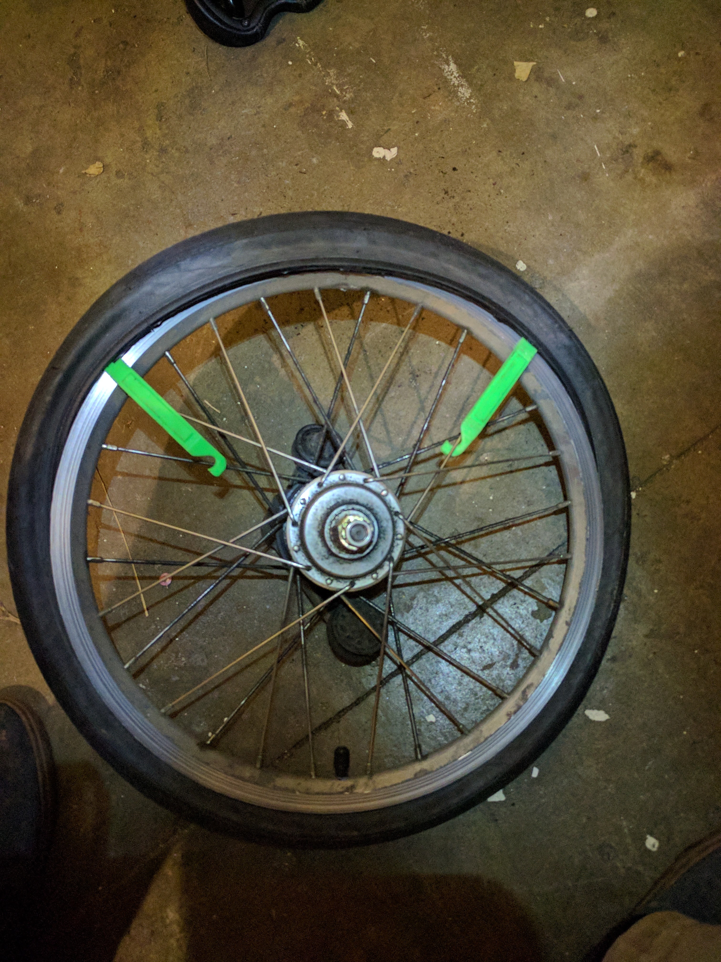 Tire levers in action. They worked pretty well. I chipped the first tool when putting the tire back on though.